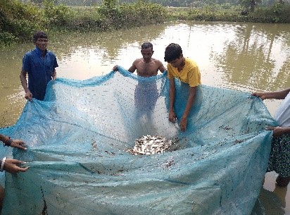 The Fishery Department provided training to the farmers and contributed 10,000 additional fingerlings worth Rs. 25,000, benefiting 93 households in 4 villages across 3 GPs. As a result of these efforts, farmers produced fish and earned an average of Rs. 7,794 each from sales.